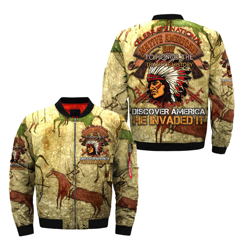 Keep yourself warm in this unique Celebrate Native American Day Bomber Jacket. It is stylish and comfortable, while still being functional. Made with a soft polyester outer shell to help keep you warm.