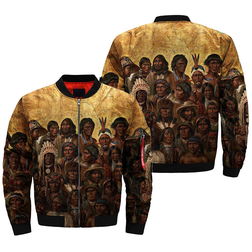The Great Vintage Native Bomber Jacket is a modern take on a traditional leather bomber jacket. It features suede leather sleeves, slanted pockets and small zipper detail on the back while the front has an all-over printed pattern inspired by Native American designs. Wear it on adventures or to complete your day-to-day look