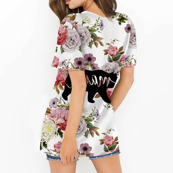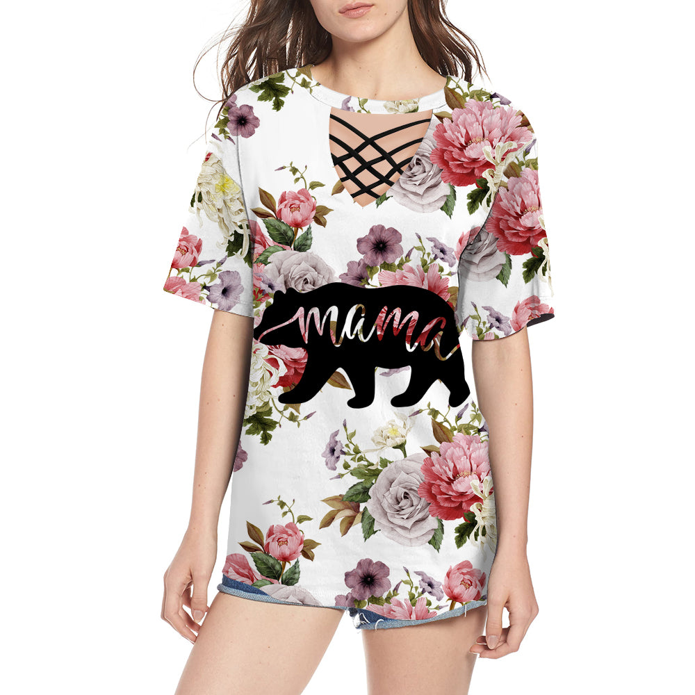 Mama Bear Flower Rose Round Neck Hollow Out Tshirt
