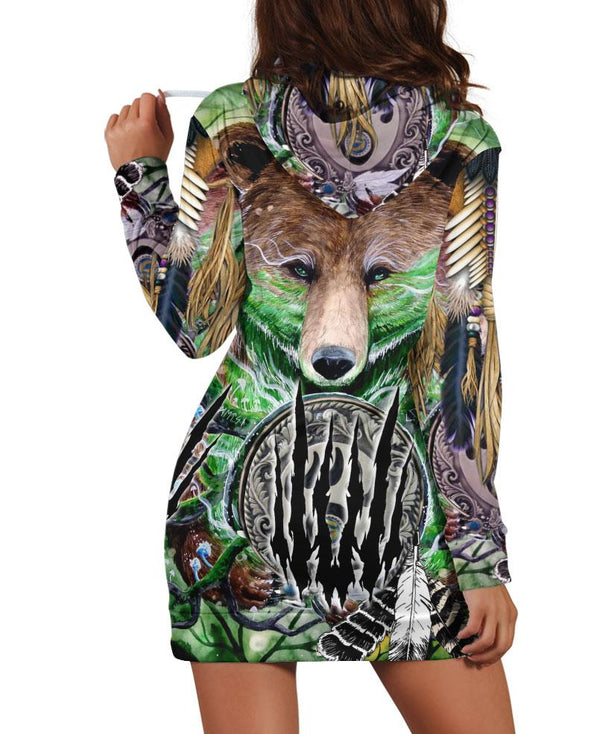 Our Native American Bear Green Hoodie Dress is perfect for running errands, hanging out with friends and family, or even the office if you’re lucky! This trendy dress features an abstract print and relaxed fit that can easily be paired with your favorite sandals or boots.