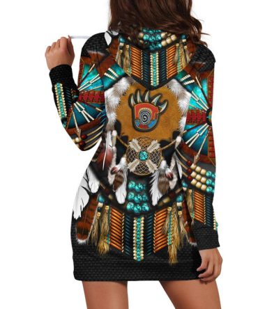 This pullover Native American Bison Skull Hoodie Dress features a beautiful natural background with a tribal pattern. The Native American design on this fashion top is perfect for casual wear or special occasions.