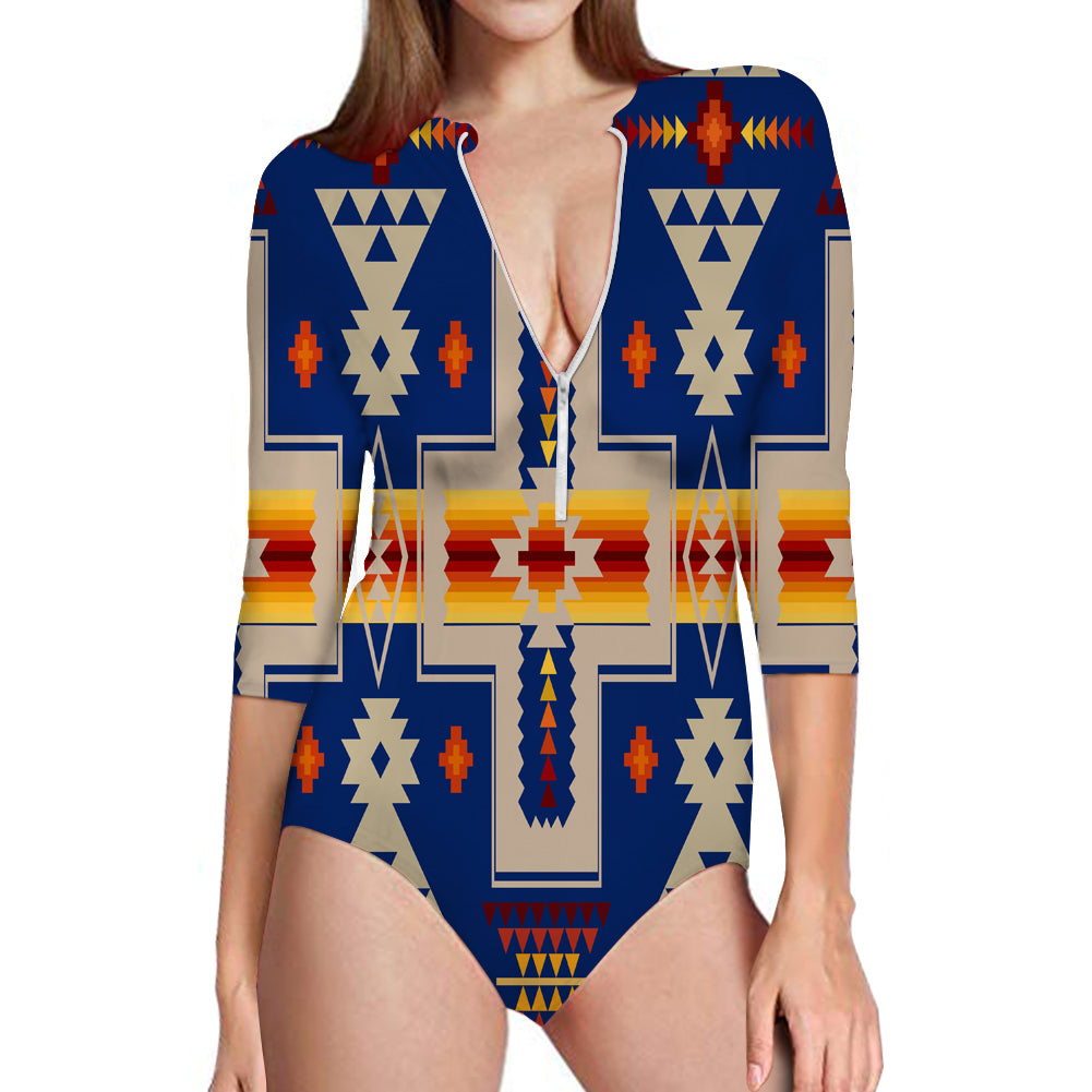 - Long sleeve one piece for full sun protection, zip back entry. Full coverage