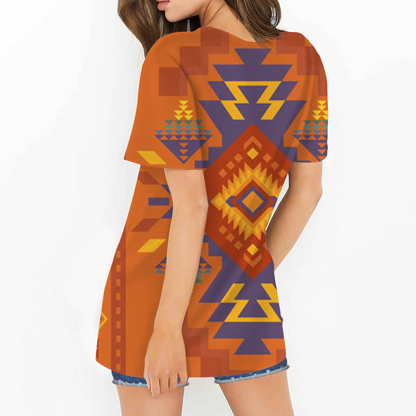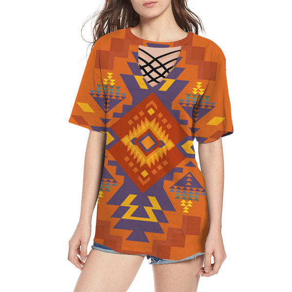 Orange Pattern Round Neck Hollow Out Tshirt