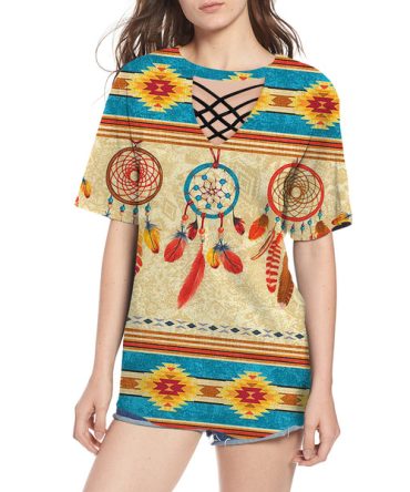Pink Tribes Pattern Native American Neck Hollow Out Tshirt