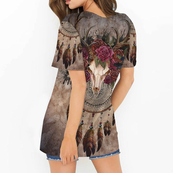 Skull Bison With Rose Round Neck Hollow Out Tshirt