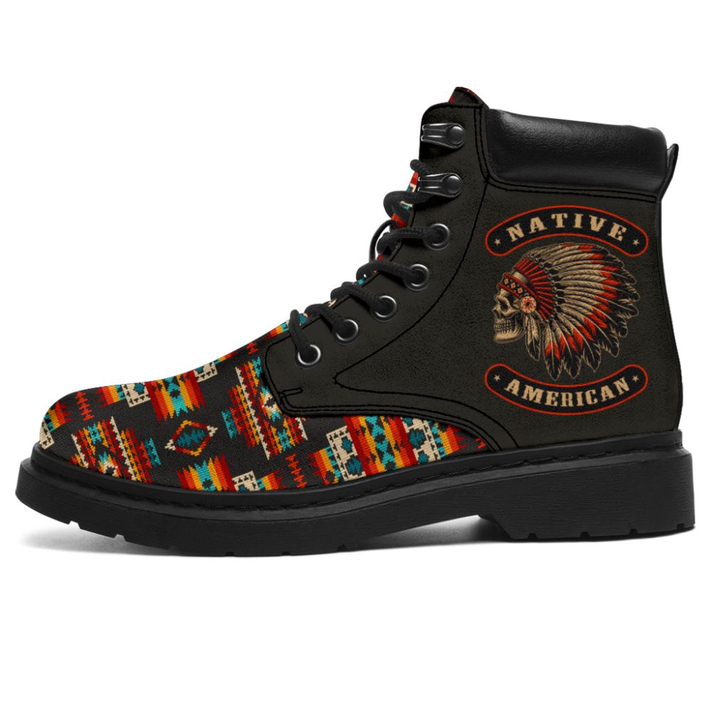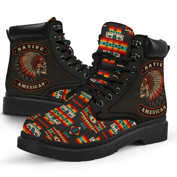 The Skull Native American All Season Boots feature a low heel and platform, a lace up closure, and a vegan suede uppers. Available in Black, Light Brown and Dark Brown