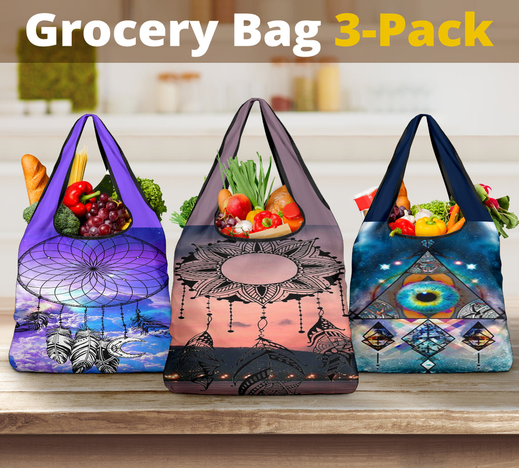 - Add style and personality to your grocery shopping routine with a 3-pack of custom printed grocery bags!