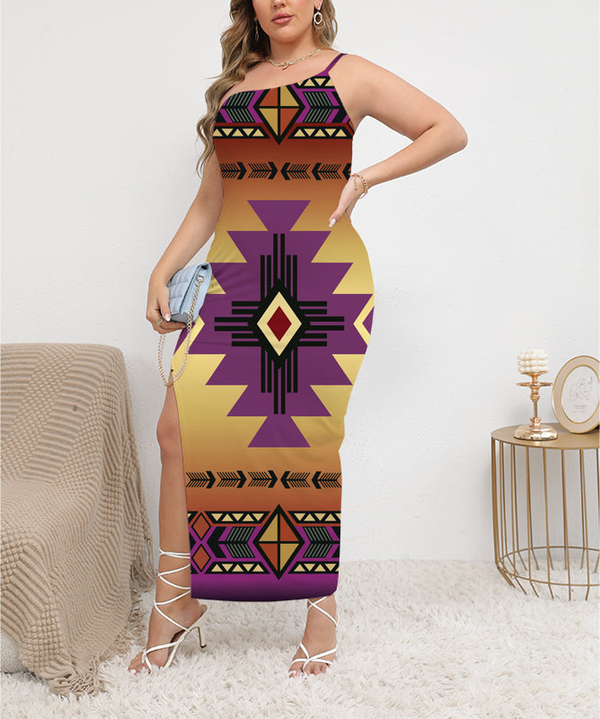 Be the first to review “Southwest Purple Arts Oblique-Shoulder Exposure Dress With Side Split”