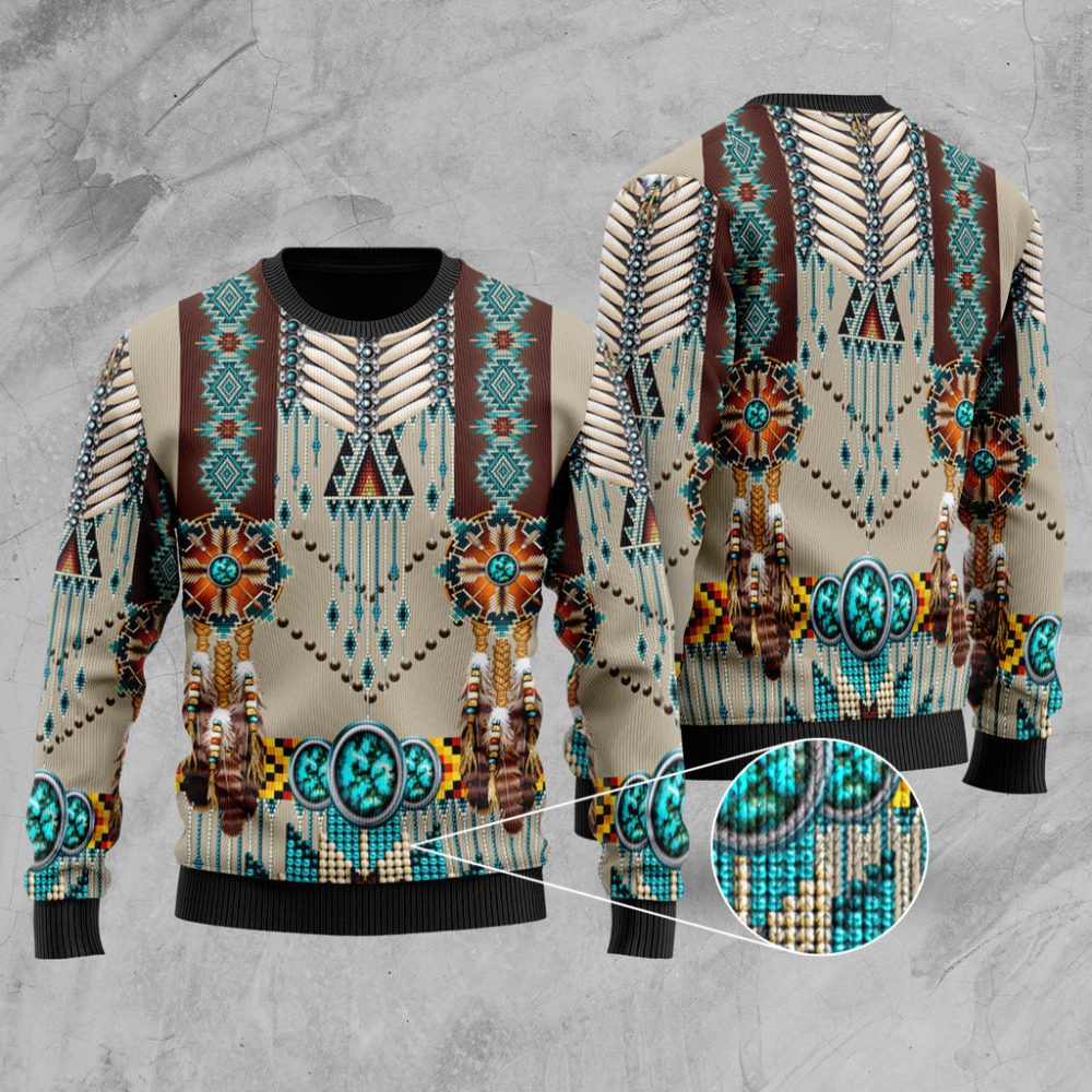 Turquoise Blue Pattern Breastplate Native American Sweater is a perfect gift for everyone. The beautiful design, along with the warm sweater, makes the perfect one-of-a-kind gift. This item comes in an array of sizes and colors available to ensure that you find a color that fits your personality