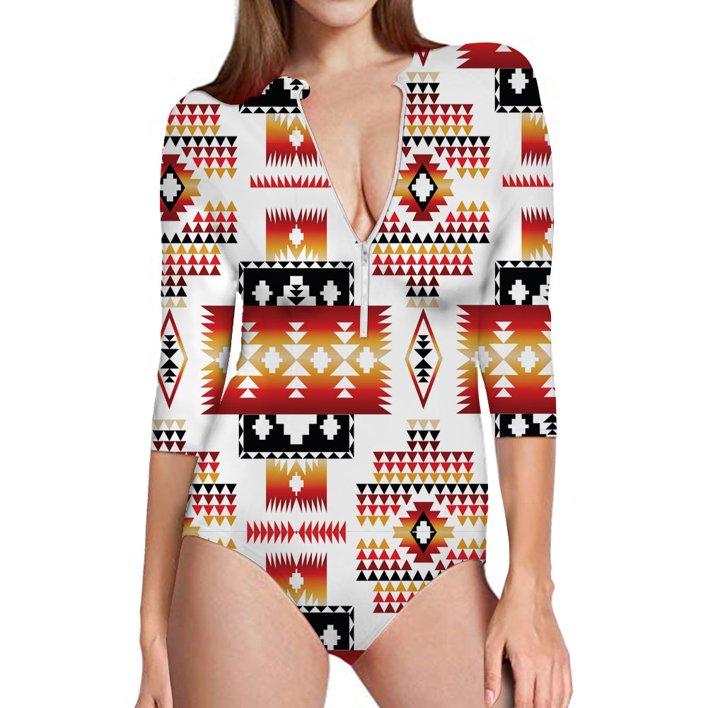 - Long sleeve one piece for full sun protection, zip back entry. Full coverage