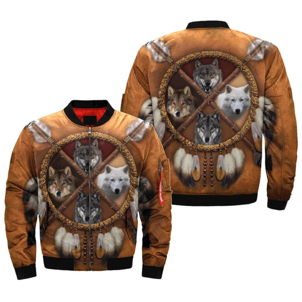 This Native Bomber Jacket by 4 Wolves is a lightweight and comfortable jacket. The design features dreamcatchers, feathers and buckles, making it perfect for all routes you need to travel in style.