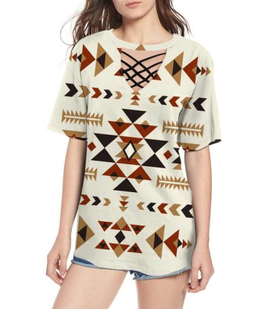 Yellow Tribes Pattern Native American Round Neck Hollow Out Tshirt